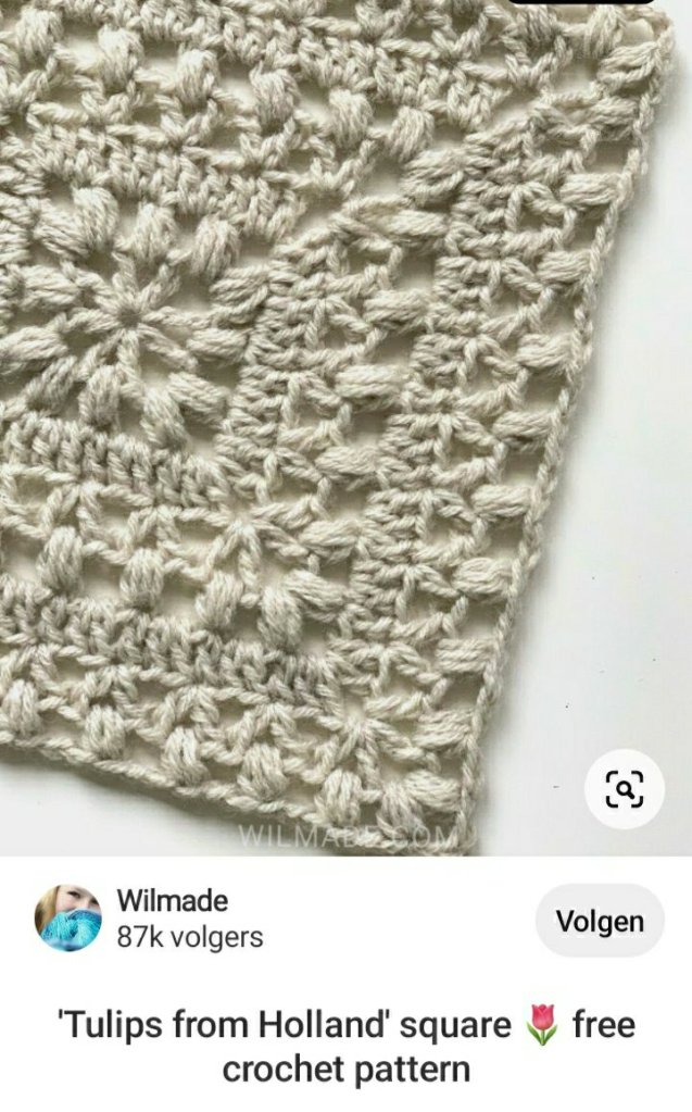 Deze granny-square heet de ‘Tulips from Holland’ en ik was gelijk verliefd toen ik deze zag. Voor mijn truitje heb ik 8 van deze squares gehaakt. Het patroon daarvan kun je vinden op wilmade.com, op pinterest middels onderstaande link of lekker meehaken via onderstaande link van youtube