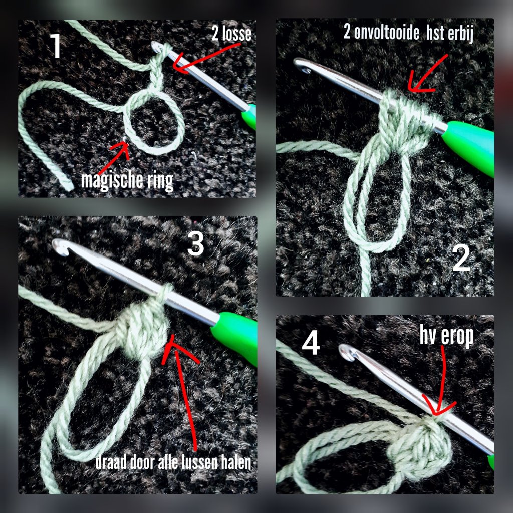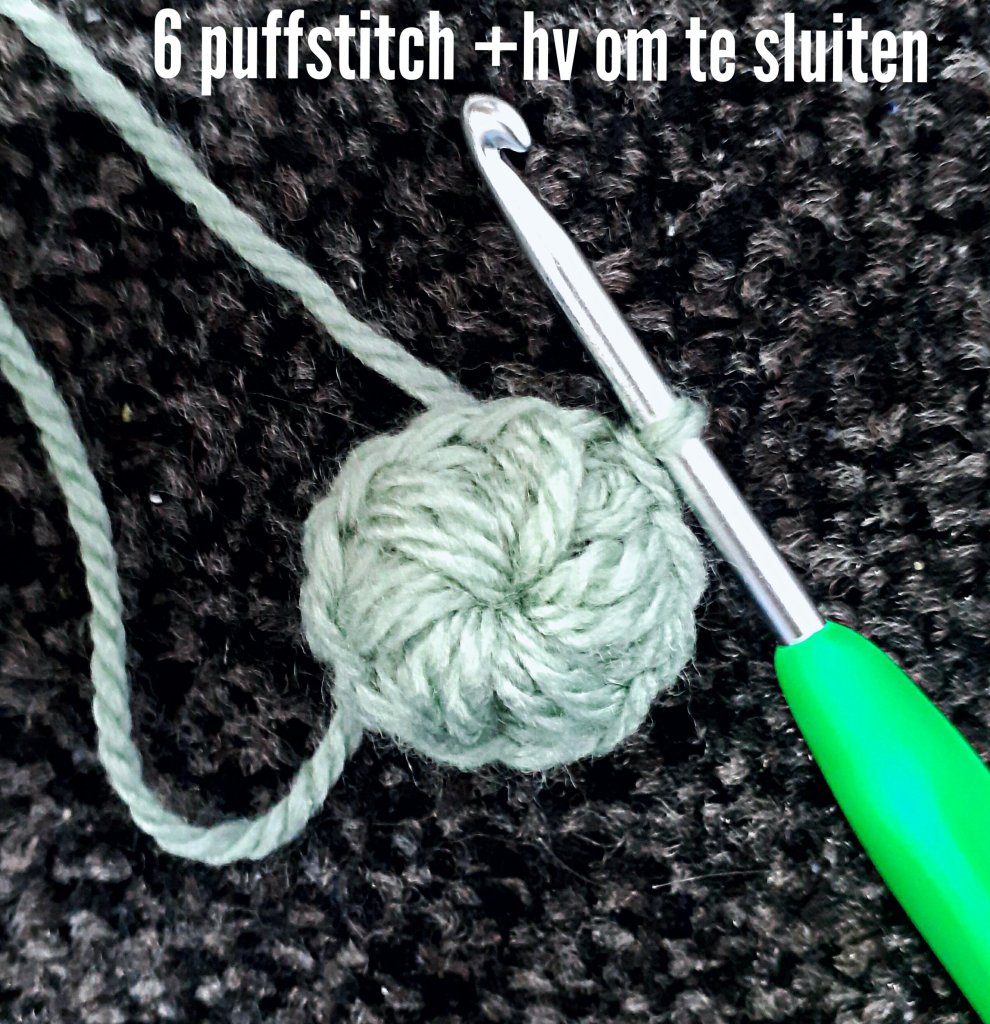 Maak een magische cirkel en doe daar 6 puffsteken in. Mijn eerste puffsteek begint met 2 losse (foto 1). Hierop sla je de draad om je naald, steek je naast je twee losse in, haalt je draad op maar haalt deze nog niet door je lus heen. Dan sla je nogmaals de draad om je naald, steek je naast de vorige losse in, haalt de draad op (foto 2) Nu haal je de draad door alle lussen heen (foto 3). Hierop volgt nog 1 (hv) losse erop. (foto 4) de puffsteken die hierna volgen beginnen niet met twee losse, maar met het insteken met omgeslagen naald (drie keer). Na 6 puffsteken maak je een halve vaste in de tweede losse van je eerste steek (foto 5)