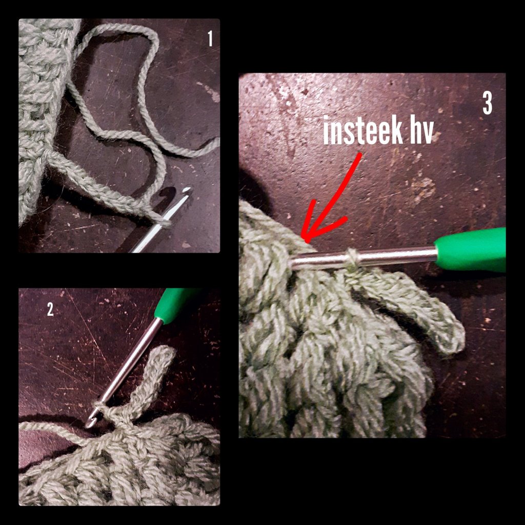 Rij 3: 2 halve vaste, (2 puffsteken, 2x puffsteek in 1 ruimte) 6x. Sluit met een halve vaste