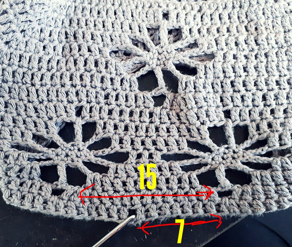7 st, 5l, 5 steken overslaan, 5v, 5l, 5 steken overslaan, 3 st, 5l, 5 steken overslaan, 5v, 5l, 5 steken overslaan, 3 st, 5l, 5 steken overslaan, 5v, 5l, 5 steken overslaan, 7 st, hoek,