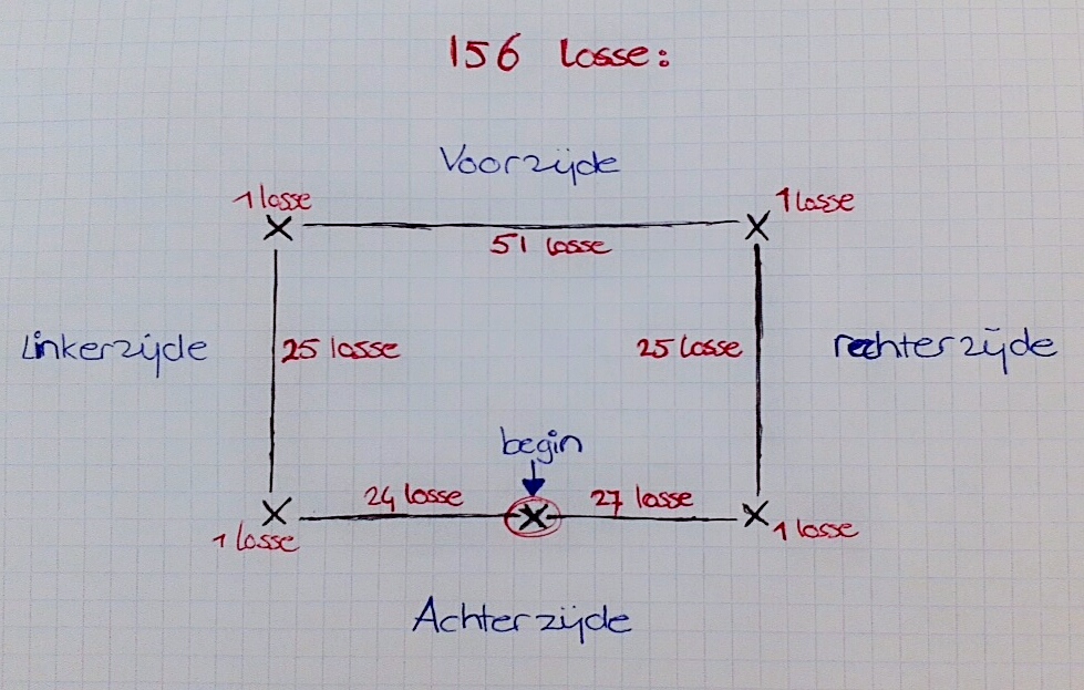 Voor de hakers die graag schema’s lezen, heb ik hieronder een schema gemaakt waarop je kunt zien hoe ik aan die 156 losse ben gekomen…… Voor de mensen die hier juist erg zenuwachtig van worden omdat het geen enkele vorm van logica vormt: Niet je hoofd over breken, het schema heb je niet persé nodig voor dit patroon!