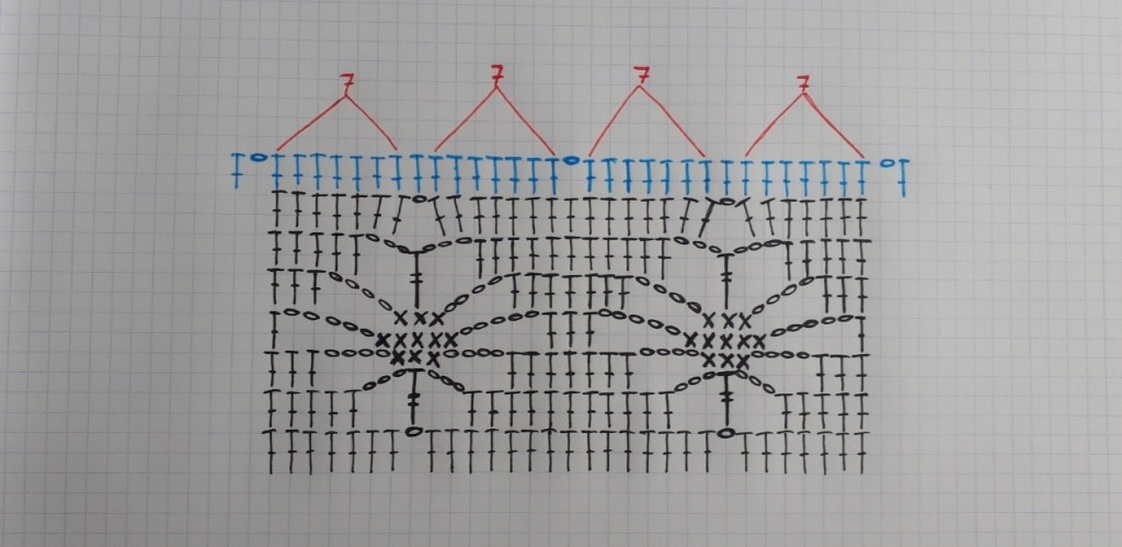7 st, 5l, 5 steken overslaan, 5v, 5l, 5 steken overslaan, 3 st, 5l, 5 steken overslaan, 5v, 5l, 5 steken overslaan, hv in de 2e opzetlosse van de rij.