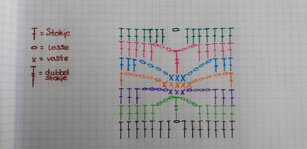 9 st, 3l, 2 steken overslaan, Dst in de losse van de vorige rij, 3l, 2 steken overslaan, 11 st, 3l, 2 steken overslaan, Dst in de losse van de vorige rij, 3l, 2 steken overslaan, 11 st, 3l, 2 steken overslaan, Dst in de losse van de vorige rij, 3l, 2 steken overslaan, 9 st, hoek,