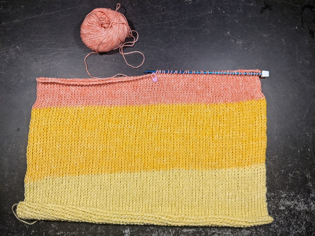 Wissel hierna weer naar de licht gele kleur en haak 24 rijen in de tunische tricotsteek.